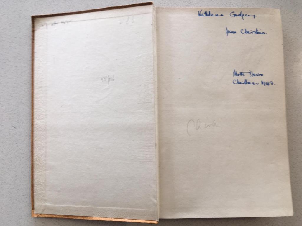 Kathleen talks about her ‘house in Kent’ (Motts Down is just over the border in Sussex, she may well have moved around in the area, or perhaps it is where Christina lived); and her father Admiral Godfrey, allegedly the model for Ian Fleming’s ‘M’, commanded ships on the China station. That would account for the address and potentially for the interest in China. Kathleen, only sixteen when the war broke out, trained as a radio operator and worked at Bletchley Park during the war. In October 1943 her grandfather through her a 21st birthday party at the Savoy; she doesn’t talk about Christmas 1943 but if she is indeed the first owner of this book, it would have been gifted to her shortly after.