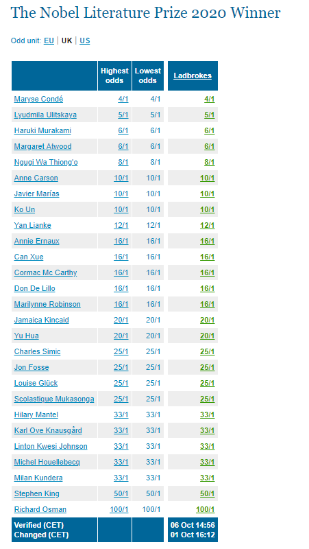 It’s Nobel Prize week! It always sneaks up on me. I love Nobel Prize week. After three days of unspeakably brilliant scientists whose achievements I can barely comprehend, it’s time for literature. Haruki Murakami, Margaret Atwood and Ngugi Wa Thiong’o are once again the hot tips – I can’t think of a year when they haven’t been. Maybe it’s one of their years?